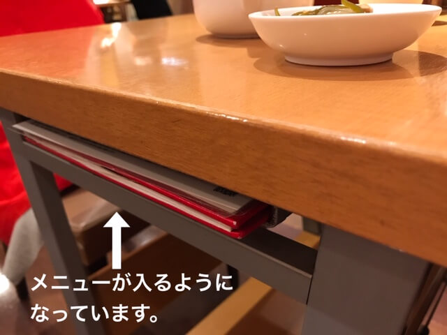 鼎泰豐(ディンタイフォン)横浜高島屋店ではメニューがテーブルの下に入るようになっています。お料理の追加やデザートを頼みたくなった時に便利ですね。
