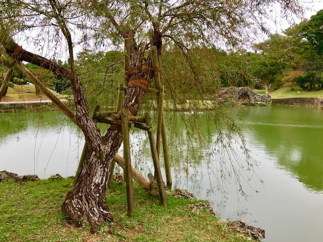 廻遊式庭園(かいゆうしきていえん)の識名園では園内中央にある池の景色をさまざまな角度から楽しむ事ができます。