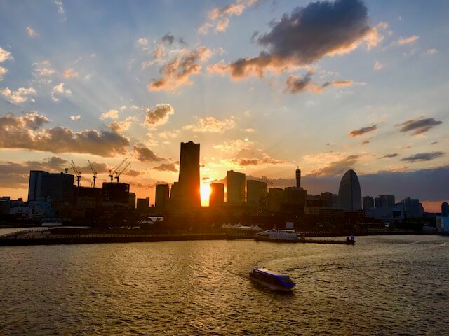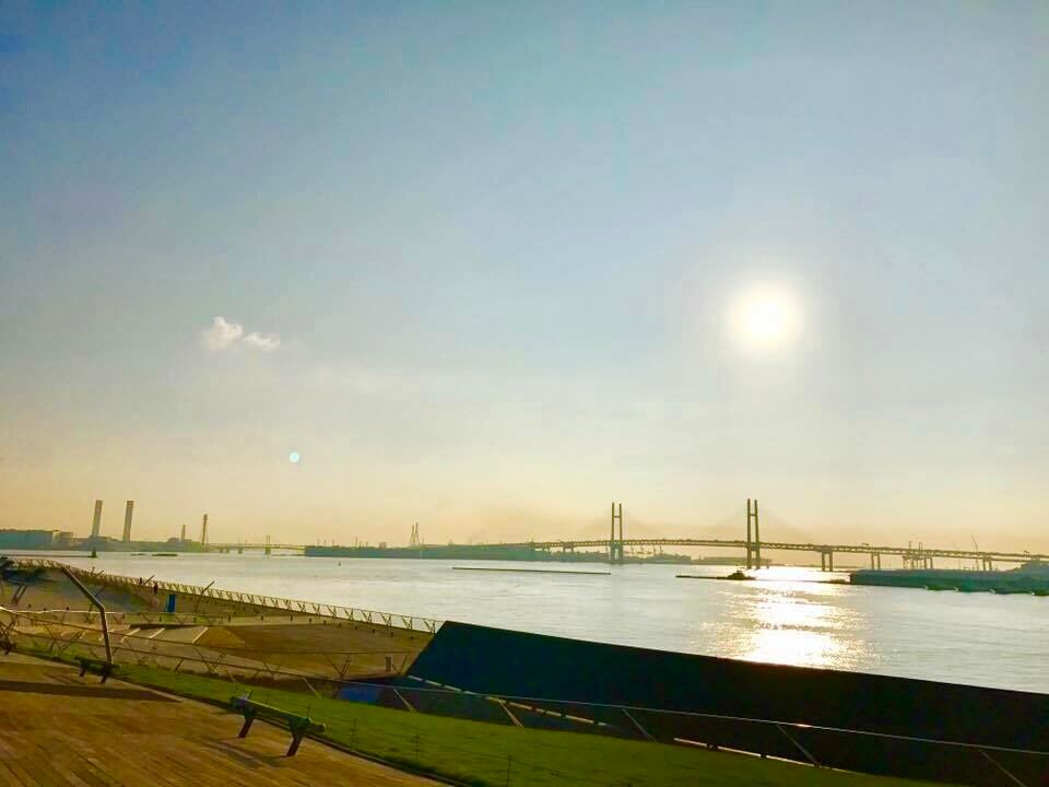 朝は横浜ベイブリッジの向こうから朝日が昇り、