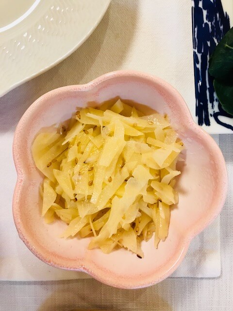 じゃが芋を薄く細切りにスライスして水につけた後、酢と塩で炒めます。