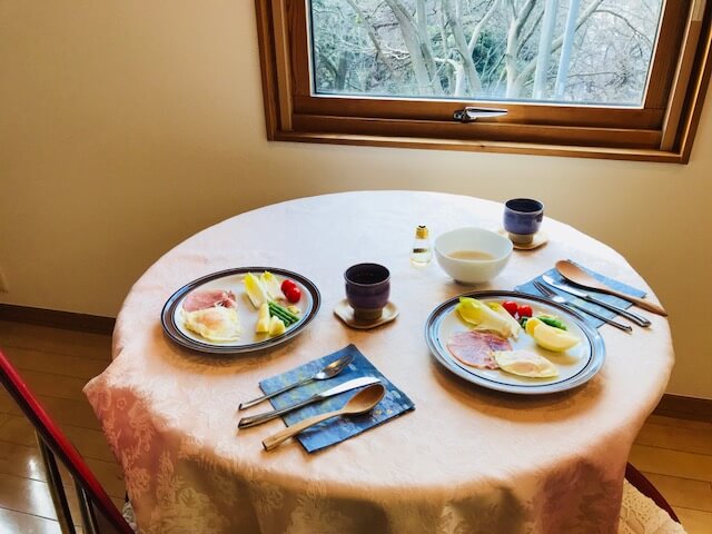 週末の朝は窓側の丸テーブルでカフェっぽく朝食をとることにしています。